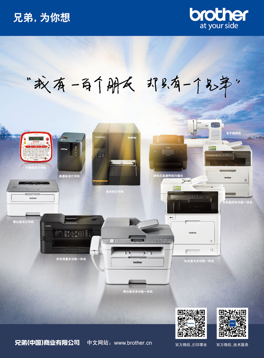 Brother作為擁有110多年歷史的國(guó)際化品牌,目前已在全球40個(gè)以上的國(guó)家和地區(qū)擁有研究開(kāi)發(fā)基地、生產(chǎn)基地以及銷售公司。作為Brother集團(tuán)在中國(guó)的產(chǎn)品銷售與服務(wù)的外商獨(dú)資企業(yè),兄弟(中國(guó))充分利用集團(tuán)的資源優(yōu)勢(shì),秉承“At your side.”的企業(yè)文化理念,遵循顧客第一的宗旨,傾聽(tīng)顧客的呼聲,為中國(guó)消費(fèi)者提供更多具有高附加值的產(chǎn)品和服務(wù)。兄弟(中國(guó))的事業(yè)領(lǐng)域包括以打印機(jī)、多功能一體機(jī)、傳真機(jī)、標(biāo)簽打印機(jī)、掃描儀等產(chǎn)品為代表的打印及解決方案事業(yè);以家用縫紉機(jī)、商用繡花機(jī)、電腦花樣裁切機(jī)為中心的家用機(jī)器事業(yè)。