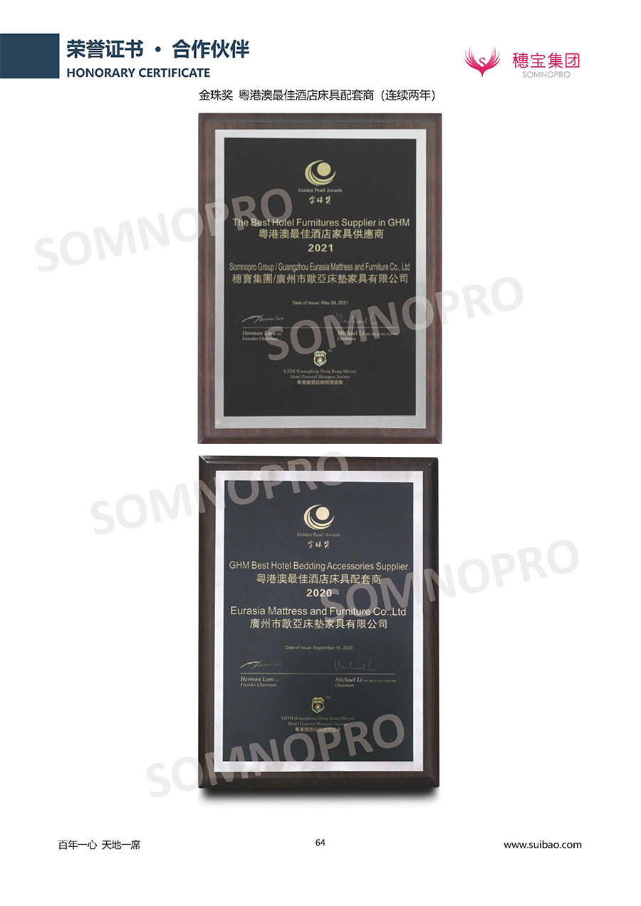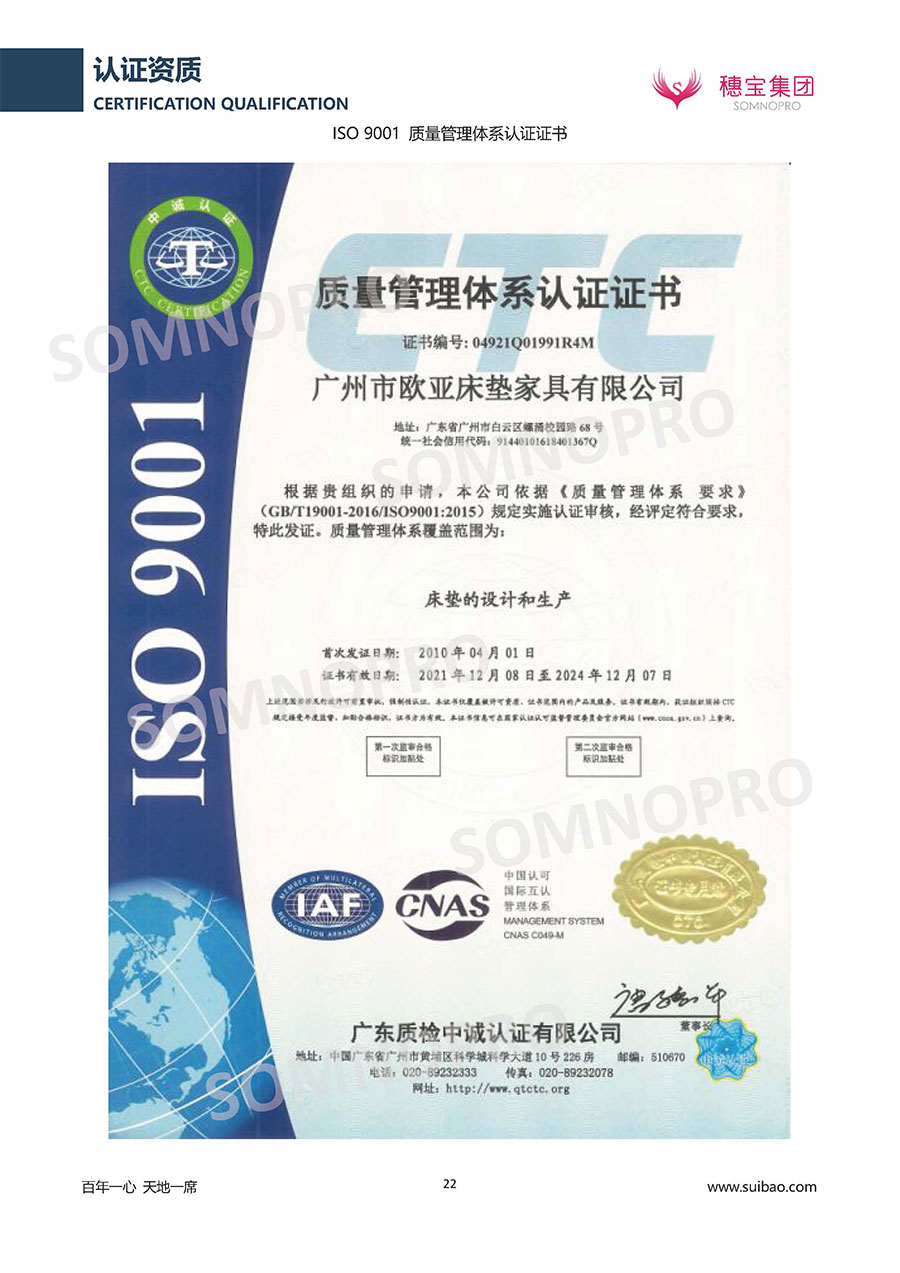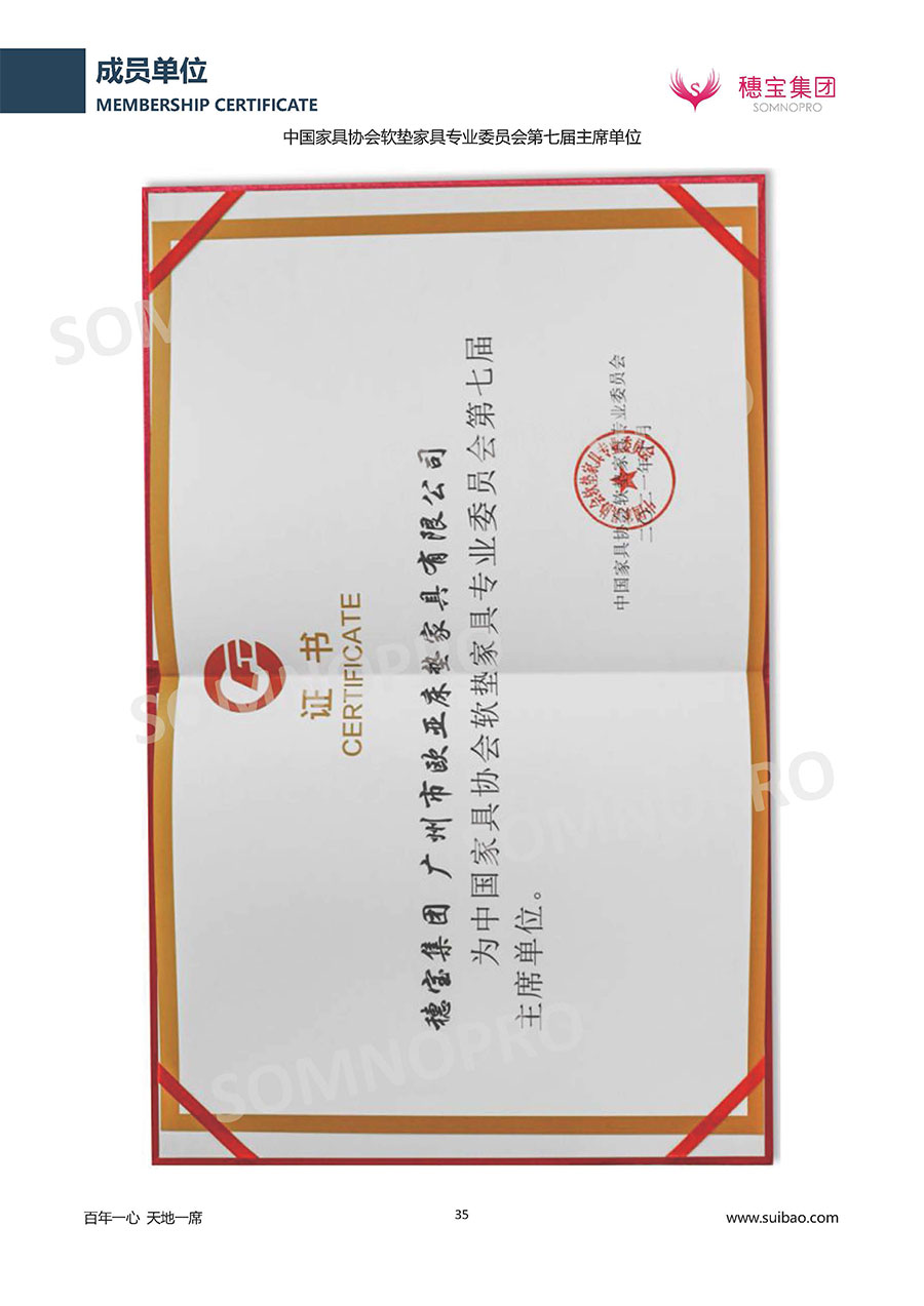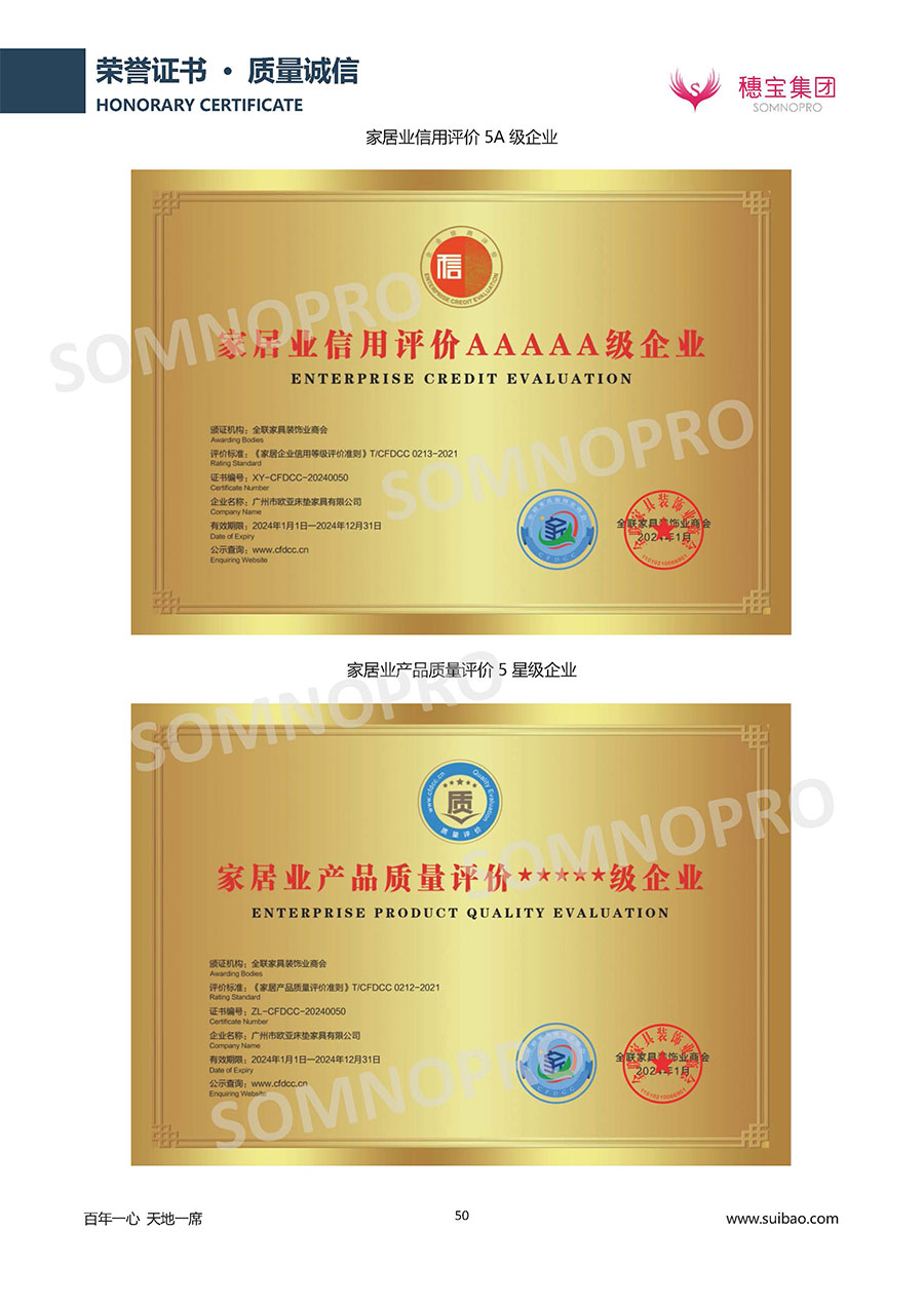 本著高品質(zhì)、高效率、重管理的原則,穗寶已通過ISO9001質(zhì)量管理體系認(rèn)證證書、ISO14001環(huán)境管理體系認(rèn)證證書、ISO45001職業(yè)健康安全管理體系認(rèn)證證書、中國環(huán)境標(biāo)志產(chǎn)品認(rèn)證證書、家居綠色環(huán)保領(lǐng)跑品牌、綠色正品家居品牌、企業(yè)標(biāo)準(zhǔn)“綠色領(lǐng)跑者”證書、CMS測量管理體系證書、CMS測量管理體系證書附件、廣東省“守信用重合同”企業(yè)、廣州歐亞-納稅信用A級納稅人(連續(xù)5年:2018-2022)、2024年中國500最具價值品牌,品牌價值高達(dá)302.89億元、廣東高價值商標(biāo)品牌(穗寶)、廣東省重點商標(biāo)保護(hù)名錄納入證明、廣州市勞動關(guān)系和諧企業(yè)AA級。穗寶自創(chuàng)立以來,不斷致力于新產(chǎn)品的設(shè)計與研發(fā),多次在國內(nèi)家具展會屢獲獎項,產(chǎn)品暢銷國內(nèi)外,深受客戶一致好評。