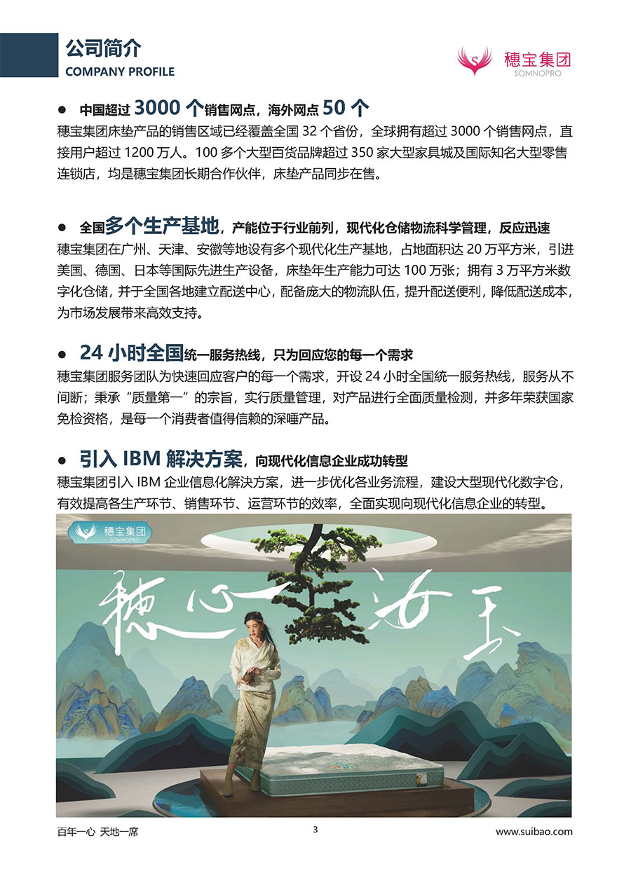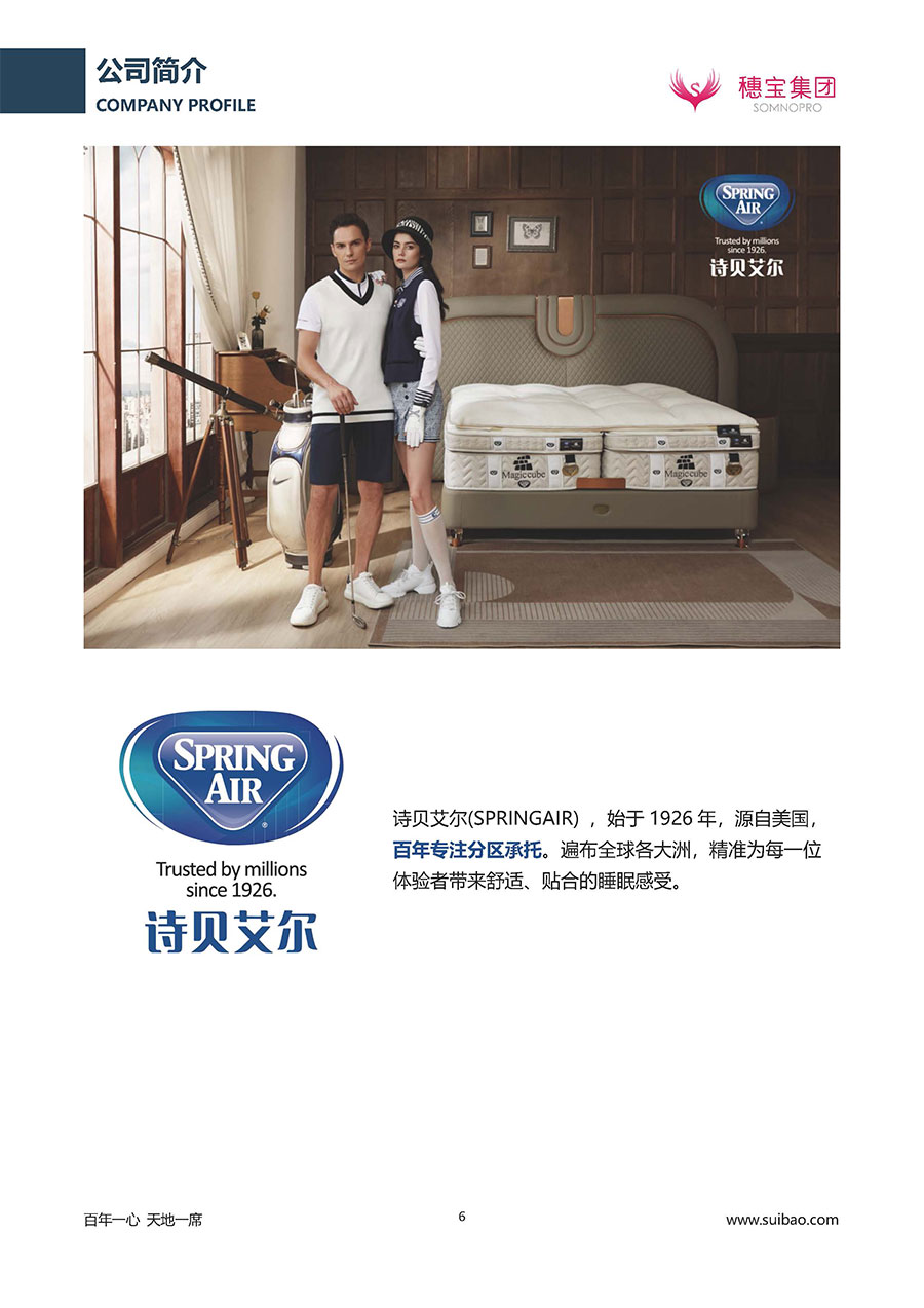 作為大家居行業(yè)的品質(zhì)倡導(dǎo)者,穗寶集團(tuán)不斷創(chuàng)新,豐富品牌實力,致力推動中國床墊產(chǎn)業(yè)發(fā)展。至今,穗寶集團(tuán)旗下?lián)碛卸鄠€來自世界各地的優(yōu)質(zhì)品牌,包括:穗寶、詩貝艾爾、百納璐詩、睡客小鎮(zhèn)、Mr.Z早先生等;此外,穗寶集團(tuán)從世界各地甄選適合不同消費(fèi)者的優(yōu)質(zhì)睡眠產(chǎn)品,定制屬于您的睡眠空間。如今,穗寶集團(tuán)形成以研發(fā)、生產(chǎn)和銷售床墊為主營業(yè)務(wù),涉及家具、家居裝飾、酒店配套等多項業(yè)務(wù)的企業(yè)群體。