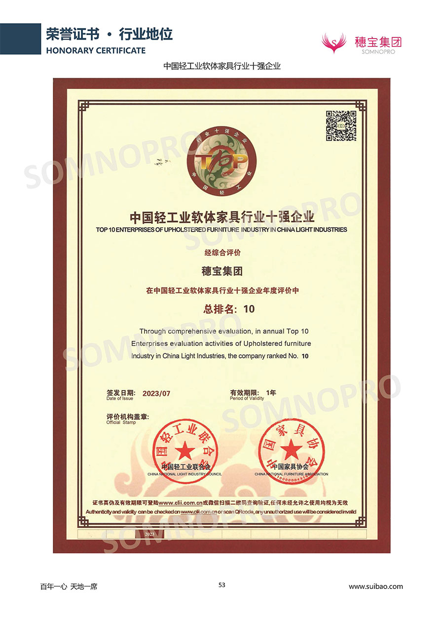半個世紀(jì)的付出,穗寶集團(tuán)在深度睡眠領(lǐng)域收獲非凡成就,贏得業(yè)界與社會的一致贊譽(yù)。作為大家居行業(yè)的品質(zhì)倡導(dǎo)者,穗寶集團(tuán)不斷創(chuàng)新,豐富品牌實力,致力推動中國床墊產(chǎn)業(yè)發(fā)展。至今,穗寶集團(tuán)旗下?lián)碛卸鄠€來自世界各地的優(yōu)質(zhì)品牌,包括:穗寶、詩貝艾爾、百納璐詩、睡客小鎮(zhèn)、Mr.Z早先生等;此外,穗寶集團(tuán)從世界各地甄選適合不同消費(fèi)者的優(yōu)質(zhì)睡眠產(chǎn)品,定制屬于您的睡眠空間。如今,穗寶集團(tuán)形成以研發(fā)、生產(chǎn)和銷售床墊為主營業(yè)務(wù),涉及家具、家居裝飾、酒店配套等多項業(yè)務(wù)的企業(yè)群體。