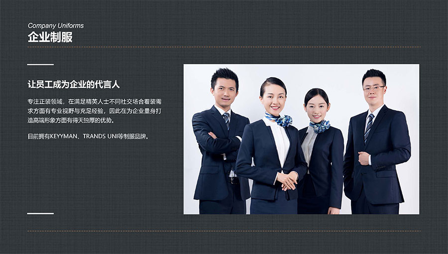 凱門(mén)品牌(KEYYMEN):高級(jí)職業(yè)裝品牌,企業(yè)形象定制專(zhuān)家。以精湛工藝及最優(yōu)性?xún)r(jià)比打造高品質(zhì)、個(gè)性時(shí)尚的企業(yè)形象,專(zhuān)屬于那些為理想、為事業(yè)打拼,并在成功過(guò)程中享受生活的職場(chǎng)團(tuán)隊(duì)及精英人士。