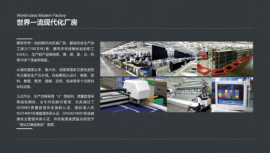 多年來(lái),大楊集團(tuán)深耕主業(yè)、堅(jiān)守實(shí)業(yè),積極開(kāi)拓國(guó)內(nèi)外高端服裝市場(chǎng),年服裝綜合生產(chǎn)加工能力1100萬(wàn)件/套,其中年定制服裝生產(chǎn)數(shù)量穩(wěn)居全球第一。年西服出口量600萬(wàn)件/套,連續(xù)多年排名全國(guó)第一。先后被評(píng)為世界服裝行業(yè)五百?gòu)?qiáng)企業(yè)、全國(guó)服裝行業(yè)十強(qiáng)/百?gòu)?qiáng)企業(yè)、國(guó)家重點(diǎn)扶持的中國(guó)名牌出口企業(yè)、國(guó)家級(jí)重合同守信譽(yù)單位、國(guó)家級(jí)服務(wù)型制造示范企業(yè)、國(guó)家重點(diǎn)培育紡織服裝百家品牌、遼寧省數(shù)字化轉(zhuǎn)型標(biāo)桿企業(yè),榮獲全國(guó)五一勞動(dòng)獎(jiǎng)狀、全國(guó)文明單位、全國(guó)紡織行業(yè)先進(jìn)集體、全國(guó)抗擊新冠肺炎疫情先進(jìn)民營(yíng)企業(yè)、省長(zhǎng)質(zhì)量獎(jiǎng)等稱(chēng)號(hào),入選“中國(guó)服裝智能制造技術(shù)創(chuàng)新戰(zhàn)略聯(lián)盟”創(chuàng)始會(huì)員。同時(shí),大楊集團(tuán)還在同行業(yè)中率先通過(guò)“AAA級(jí)兩化融合管理體系”評(píng)定,以及ISO9001質(zhì)量管理體系國(guó)際認(rèn)證、國(guó)際準(zhǔn)入的ISO14001環(huán)境管理體系認(rèn)證、ISO45001職業(yè)健康安全管理體系認(rèn)證。