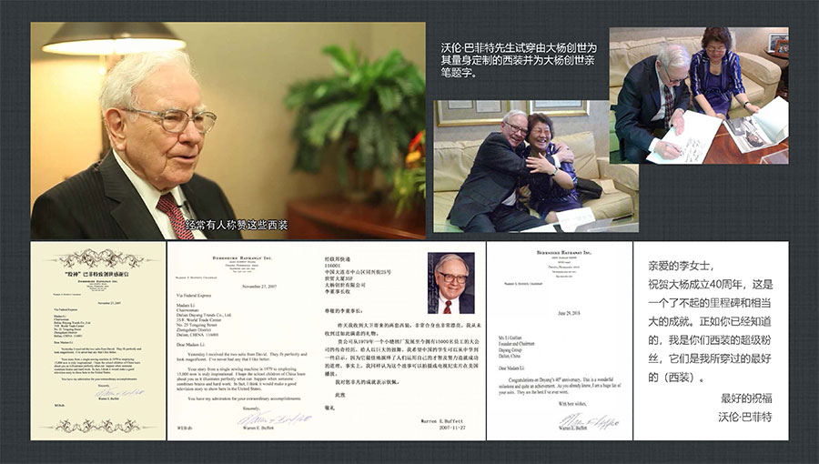 大楊集團(tuán)堅(jiān)持做民族品牌,揚(yáng)國(guó)人志氣,致力打造國(guó)際一流服裝品牌。上世紀(jì)90年代創(chuàng)立了第一個(gè)自主品牌——TRANDS(創(chuàng)世),先后榮獲“中國(guó)出口名牌”、“中國(guó)名牌產(chǎn)品”等稱(chēng)號(hào),并獲得中國(guó)服裝協(xié)會(huì)頒發(fā)的中國(guó)服裝品牌品質(zhì)大獎(jiǎng),成為當(dāng)今中國(guó)高級(jí)男裝的領(lǐng)軍品牌之一。TRANDS(創(chuàng)世)品牌申報(bào)國(guó)家非遺創(chuàng)新產(chǎn)品的“‘龍’金絲蘇繡中式華服”被授予十大類(lèi)紡織創(chuàng)新產(chǎn)品。“股神”沃倫·巴菲特、微軟主席比爾·蓋茨、世界經(jīng)濟(jì)論壇主席克勞斯·施瓦布等國(guó)際精英人士,均已成為品牌的忠實(shí)客戶(hù)。目前,大楊集團(tuán)已形成以高級(jí)男裝品牌TRANDS(創(chuàng)世)為龍頭,團(tuán)體定制高級(jí)商務(wù)裝品牌KEYMEN(凱門(mén))、高級(jí)定制品牌凱門(mén)定制、網(wǎng)上直銷(xiāo)品牌YOUSOKU(優(yōu)·搜·酷)、學(xué)生裝品牌KEYMEN KIDS等組成的自主品牌梯隊(duì)。