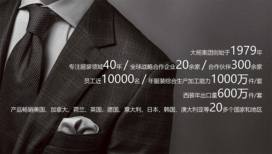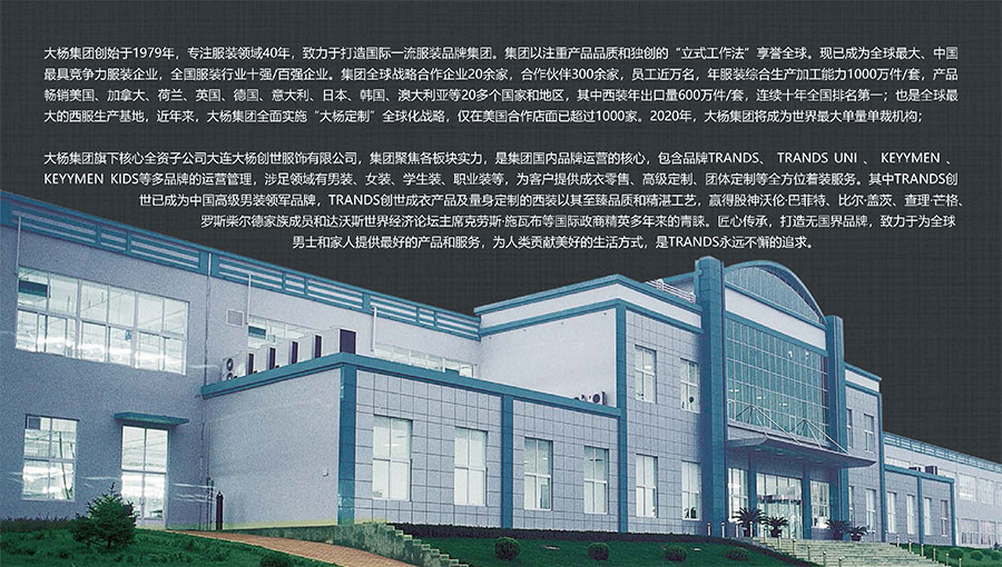 大楊集團(tuán)創(chuàng)建于1979年,總部位于遼寧省大連市,主要生產(chǎn)和銷(xiāo)售各類(lèi)中高檔服裝產(chǎn)品為主的國(guó)際化大型服裝企業(yè),以西裝縫制享譽(yù)全球,是世界重要的西裝生產(chǎn)加工基地?,F(xiàn)有直屬(控股)成員企業(yè)20家,員工4500人??毓勺庸敬筮B大楊創(chuàng)世股份有限公司2000年在上海證券交易所上市,并于2016年完成重大資產(chǎn)重組。