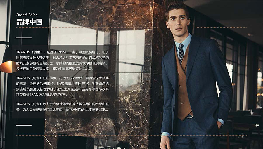 創(chuàng)世品牌(TRANDS):創(chuàng)建于1995年,是當(dāng)今中國(guó)高級(jí)男裝的代表品牌之一。TRANDS創(chuàng)世成衣產(chǎn)品及量身定制的西裝以其至臻品質(zhì)和精湛工藝,贏得眾多國(guó)際政商精英多年來(lái)的青睞。