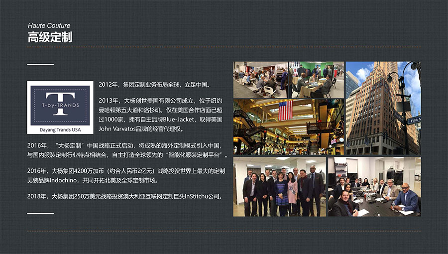 目前,大楊集團(tuán)全球營(yíng)銷(xiāo)網(wǎng)絡(luò)已遍布美國(guó)、加拿大、荷蘭、英國(guó)、澳大利亞及日本等27個(gè)國(guó)家和地區(qū),開(kāi)設(shè)單裁合作店面上千家,與加拿大互聯(lián)網(wǎng)定制巨頭Indochino公司、澳大利亞知名男裝定制企業(yè)Institchu公司、美國(guó)服裝巨頭TBI公司簽署戰(zhàn)略合作協(xié)議,年定制產(chǎn)品數(shù)量已突破200萬(wàn)件/套,具備西裝、襯衫、休閑裝以及大衣、風(fēng)衣等全品類(lèi)定制生產(chǎn)能力。