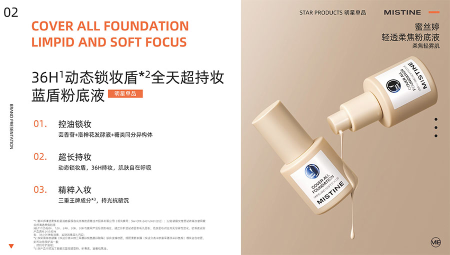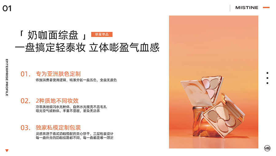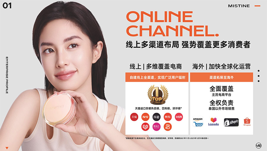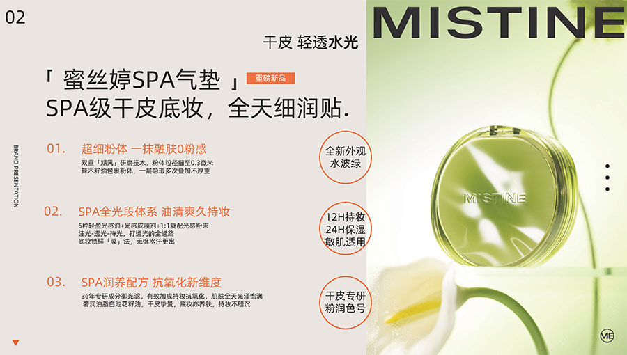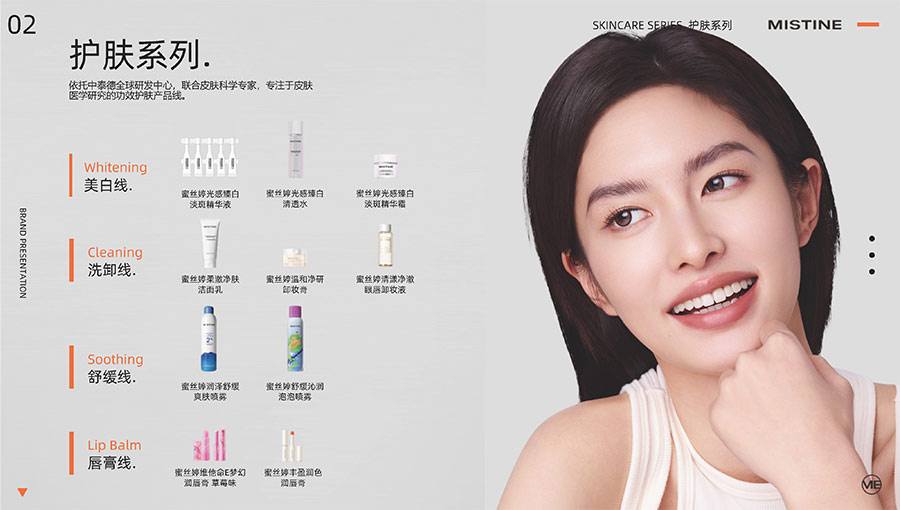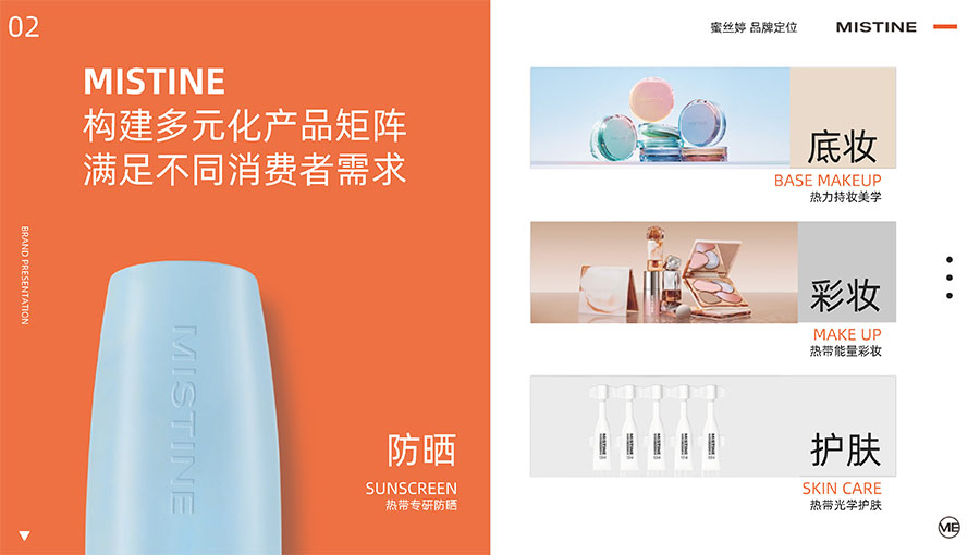 主要產(chǎn)品:MISTINE蜜絲婷防曬、美妝、底妝、彩妝、護(hù)膚、香水、個(gè)護(hù)等產(chǎn)品