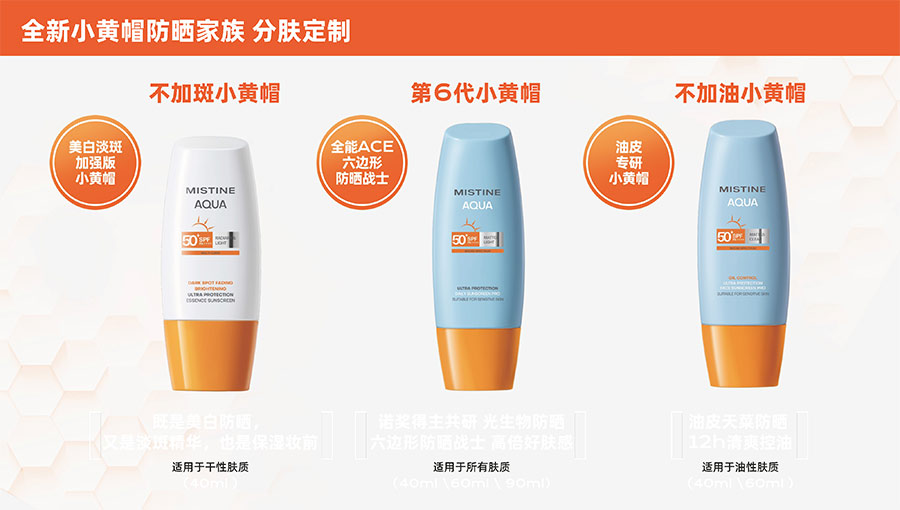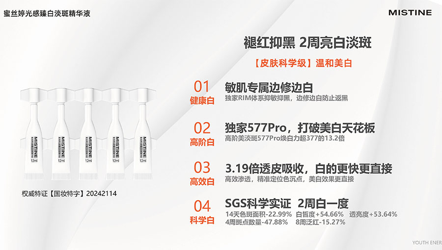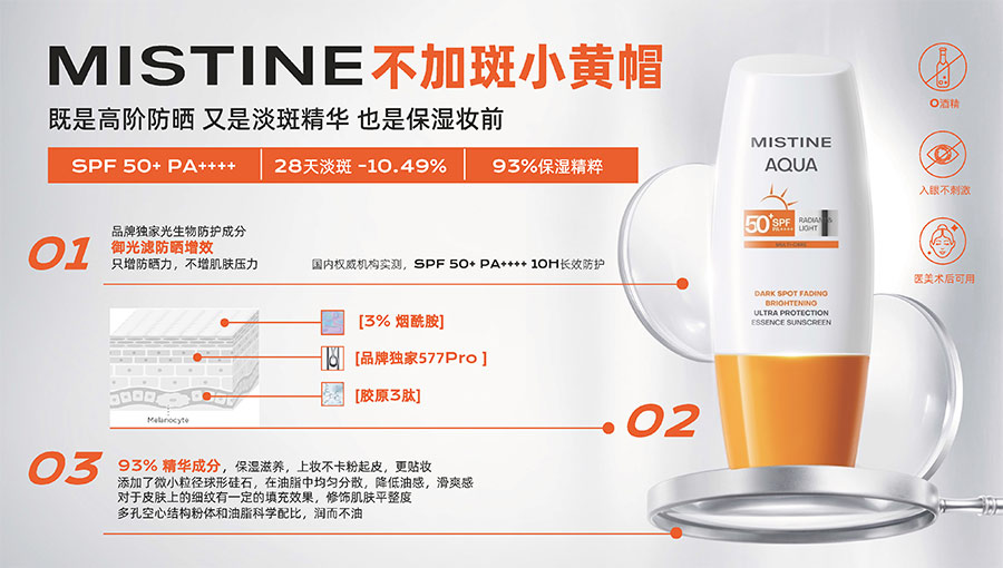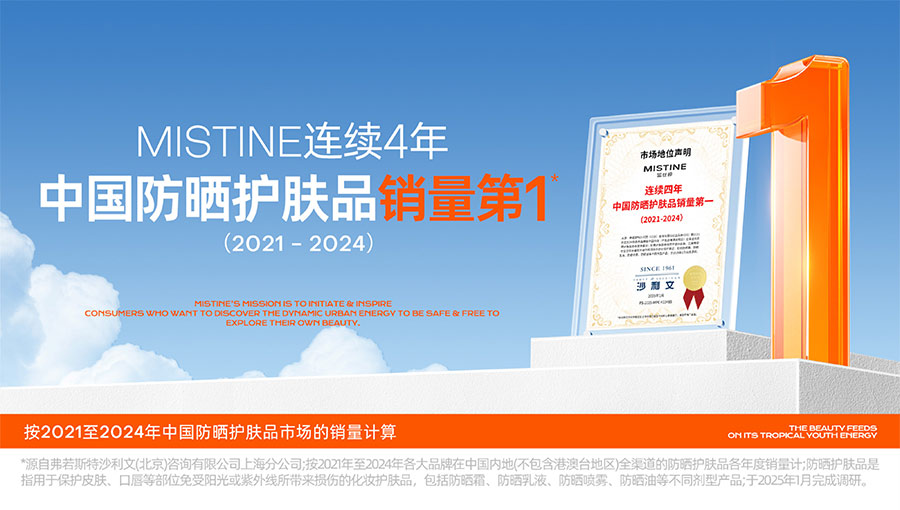 歷經(jīng)37年的科研沉淀,MISTINE蜜絲婷品牌在防曬、護(hù)膚、底妝、彩妝多個(gè)品類的產(chǎn)品開發(fā)中,堅(jiān)持圍繞對“光”的研究,在光與防曬護(hù)膚、光與色彩妝容的產(chǎn)品應(yīng)用層面,研究光、理解光、樂享光,持續(xù)不斷地提供產(chǎn)品解決方案,滿足消費(fèi)者對防曬美白、潮流妝容、護(hù)膚健康的需求。防曬系列產(chǎn)品作為MISTINE蜜絲婷的知名品類,以物化生一體的全鏈路防曬技術(shù),憑借高倍防曬、清爽膚感的高功效和高質(zhì)價(jià)比勝出,自2021年連續(xù)三年位于中國防曬護(hù)膚品銷量領(lǐng)先。