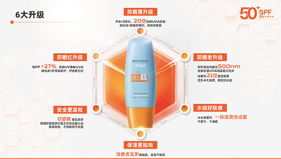 MISTINE蜜絲婷提出皮膚科學(xué)、前沿科技、靈魂成分、熱帶美學(xué)、卓越功效、保護(hù)環(huán)境六大品牌價(jià)值,致力于為全球女性提供豐富、安全、高品質(zhì)的美妝產(chǎn)品?;贛ISTINE蜜絲婷品牌首席顧問——全球計(jì)算生物學(xué)權(quán)威之一、諾貝爾化學(xué)獎(jiǎng)得主Arieh Warshel的研究,MISTINE創(chuàng)新防曬品類推出「光生物學(xué)」防曬系統(tǒng),提出“外層防護(hù)、中層修護(hù)和底層抗損”防曬新理念,引領(lǐng)防曬從“表面防護(hù)”進(jìn)入“深度抗光老”新時(shí)代。同時(shí),MISTINE蜜絲婷還持續(xù)深耕專業(yè)彩妝市場,以熱帶美學(xué)基因造就產(chǎn)品防水防汗、高倍耐曬、長效持妝的優(yōu)勢,圍繞消費(fèi)者需求打造多元化的產(chǎn)品矩陣,引領(lǐng)防曬、底妝賽道發(fā)展。
