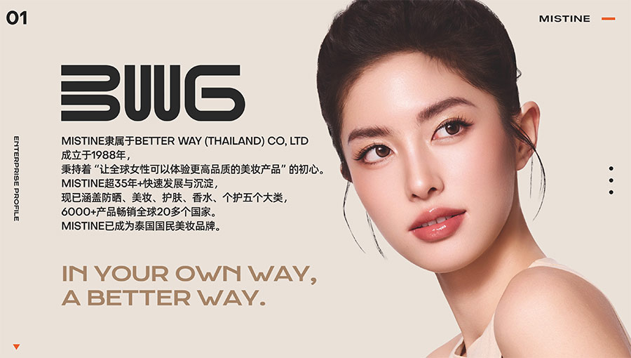 MISTINE蜜絲婷1988年始源于泰國,作為知名國際美妝品牌,擁有36年科研底蘊(yùn),產(chǎn)品種類涵蓋防曬、美妝、護(hù)膚、香水、個(gè)護(hù)五大類,擁有近6000多個(gè)單品暢銷全球20多個(gè)國家,專注為全球女性提供豐富、安全、高品質(zhì)的美妝產(chǎn)品。自2016年進(jìn)入中國后,MISTINE蜜絲婷以“熱帶青春能量美妝”為品牌定位,為年輕人打造更懂得他們的全新美妝產(chǎn)品,并傳遞獨(dú)特的健康活力生活方式。