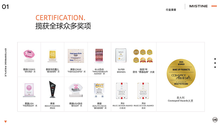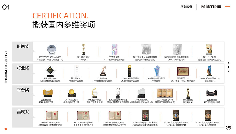 37年來,MISTINE蜜絲婷步履不停,堅(jiān)持從消費(fèi)者出發(fā),以優(yōu)質(zhì)專研產(chǎn)品、適時(shí)而動(dòng)的渠道策略和持續(xù)發(fā)力的品牌塑造,贏得眾多消費(fèi)者的喜愛和行業(yè)內(nèi)外的贊許。迄今,MISTINE蜜絲婷已連續(xù)七年攬獲“泰國選擇”大獎(jiǎng),同時(shí)先后榮獲中國化妝品大會(huì)藍(lán)玫獎(jiǎng)「年度競爭力品牌」、IQF國際品質(zhì)節(jié)暨消費(fèi)領(lǐng)導(dǎo)力峰會(huì)「杰出消費(fèi)影響力品牌」、CAQI中國質(zhì)量網(wǎng)「全國美妝行業(yè)質(zhì)量領(lǐng)先品牌」、天貓金妝獎(jiǎng)超級單品「年度防曬獎(jiǎng)」、凱度消費(fèi)者指數(shù)「極具成長力品牌」等榮譽(yù)。