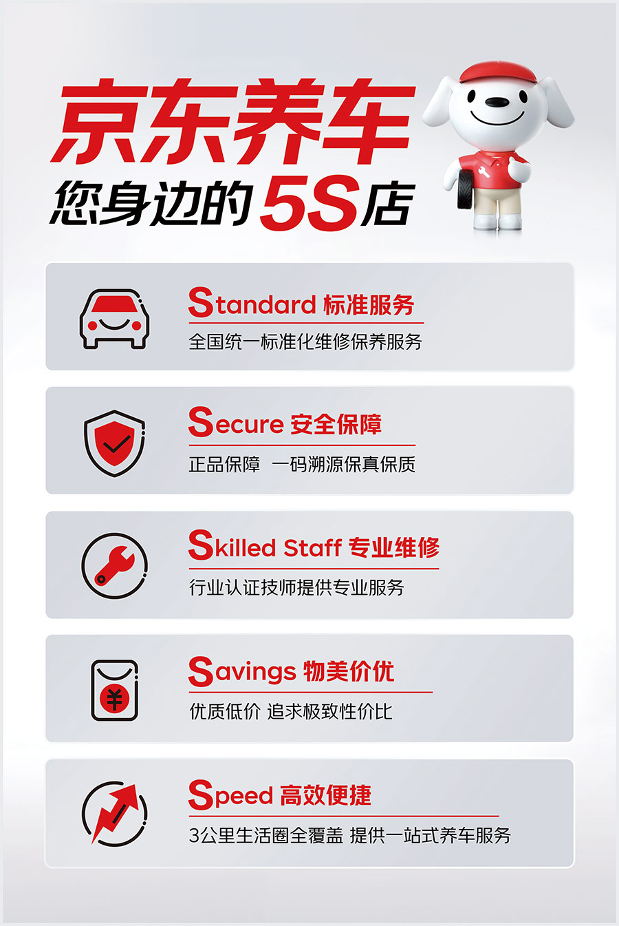 在養(yǎng)車標準方面京東養(yǎng)車秉承有保障、更專業(yè)的品牌服務理念,推出全新5S服務標準。從多個維度保障客戶權(quán)益,提升服務品質(zhì)。
