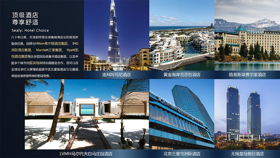 幾十年以來,絲漣始終是全球高端酒店業(yè)的首選床墊供應(yīng)商。品牌與Hilton希爾頓酒店集團(tuán)、IHG洲際酒店集團(tuán)、Marriott萬豪集團(tuán)、Hyatt凱悅酒店集團(tuán)等眾多國際知名奢華酒店集團(tuán),以及中國多個城市的國賓館保持長期穩(wěn)定合作。您可以在全球眾多燈火輝煌的超豪華及五星級酒店與它邂逅,體驗絲漣床墊帶來的舒適尊貴。