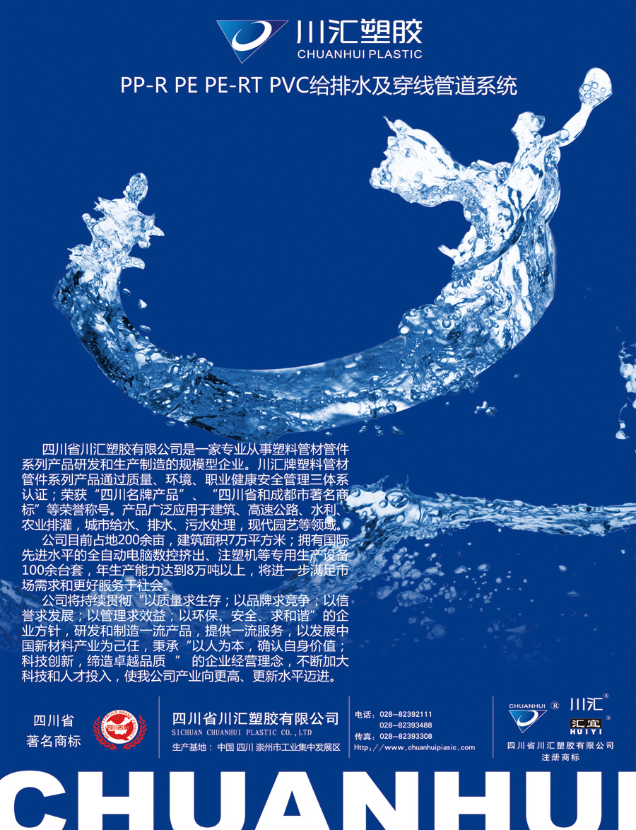 四川省川匯塑膠有限公司是一家專業(yè)從事塑料管材管件(PVC給排水管材、管件;電氣安裝用阻燃PVC塑料平導(dǎo)管(電工套管及配件);冷熱水用聚丙烯(PP-R)管材、管件;給水用聚乙烯(PE)管材、管件;燃?xì)庥寐竦鼐垡蚁≒E)管材、管件;高密度聚乙烯(HDPE)雙壁纏繞管材、管件;埋地排水用鋼帶增強聚乙烯(PE)螺旋波紋管;聚乙烯(PE)雙壁波紋管材;冷熱水用PE-RT耐熱聚乙烯地暖管材、管件;C-PVC地埋式高壓電力電纜保護管;川匯牌“匯騰”家裝精品等)、塑膠型材、塑鋼門窗、金屬管道、金屬管道的接頭及配件、球墨鑄鐵管及管件系列產(chǎn)品研發(fā)和生產(chǎn)制造的規(guī)模型企業(yè)。其產(chǎn)品廣泛應(yīng)用于建筑、高速公路、水利、農(nóng)業(yè)排灌,城市給水、排水、污水處理,現(xiàn)代園藝等領(lǐng)域。