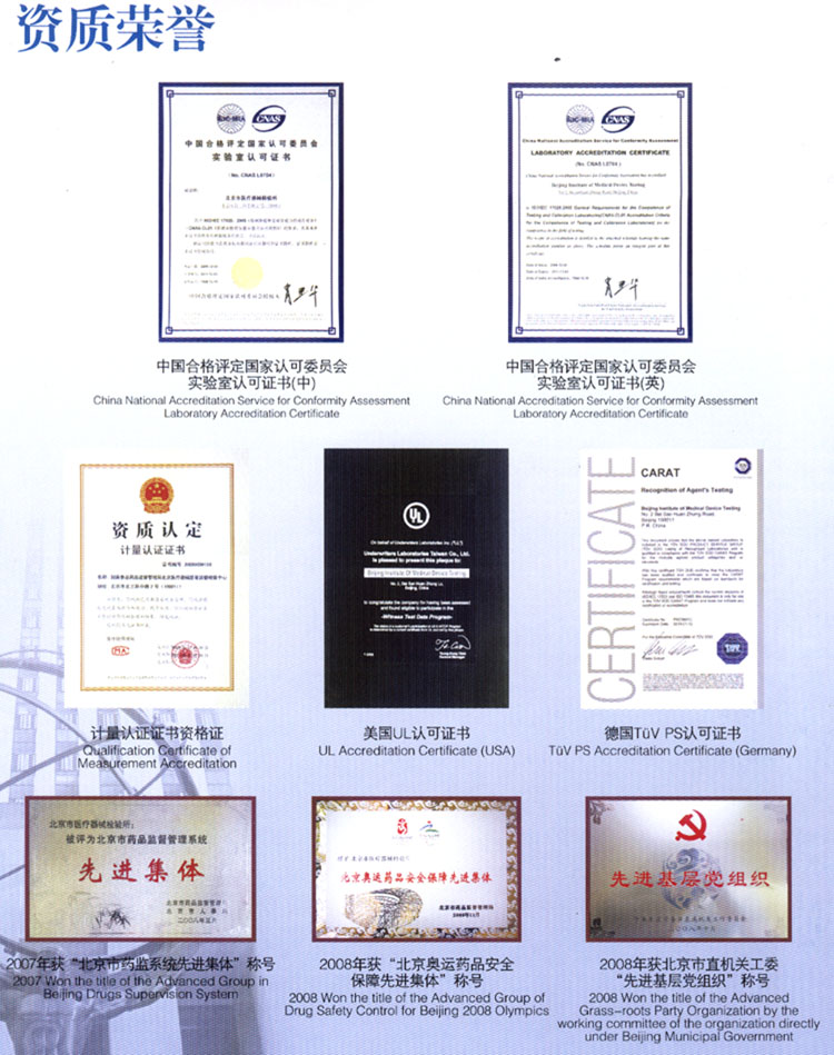 北京市醫(yī)療器械檢驗所(國家食品藥品監(jiān)督管理局北京醫(yī)療器械質(zhì)量監(jiān)督檢驗中心,以下簡稱“北檢所”)是中國合格評定國家認可委員會(CNAS)、中國國家認證認可監(jiān)督管理委員會(CNCA)、國家食品藥品監(jiān)督管理局(SFDA)等部門認可授權(quán)的一所綜合性醫(yī)療器械產(chǎn)品檢測機構(gòu)。經(jīng)CNAS授權(quán)的檢驗范圍涵蓋醫(yī)用電子、醫(yī)用射線、核醫(yī)學(xué)、電聲學(xué)、體外診斷系統(tǒng)、一次性醫(yī)療產(chǎn)品、醫(yī)用防護用品、醫(yī)用橡膠制品、口腔材料、生物安全柜、電磁兼容、生物相容性等專業(yè)領(lǐng)域,檢驗項目涉及472項;經(jīng)SFDA授權(quán)檢測項目達599項,承擔(dān)著授權(quán)范圍內(nèi)醫(yī)療器械產(chǎn)品監(jiān)督抽驗檢驗、注冊檢驗、認證檢驗、進出口商品檢驗、科技成果鑒定檢驗以及委托檢驗、仲裁檢驗等檢測任務(wù);2002年,成為中國質(zhì)量認證中心(CQC)簽約實驗室,承擔(dān)醫(yī)用X射線診斷設(shè)備、心電圖機、血液透析裝置和橡膠避孕套的強制性產(chǎn)品安全認證檢測任務(wù)。此外,該所先后獲得TüV PS、UL等國際權(quán)威認證機構(gòu)的認可,是目前國內(nèi)開展檢驗業(yè)務(wù)專業(yè)最全面的醫(yī)療器械檢驗機構(gòu)。