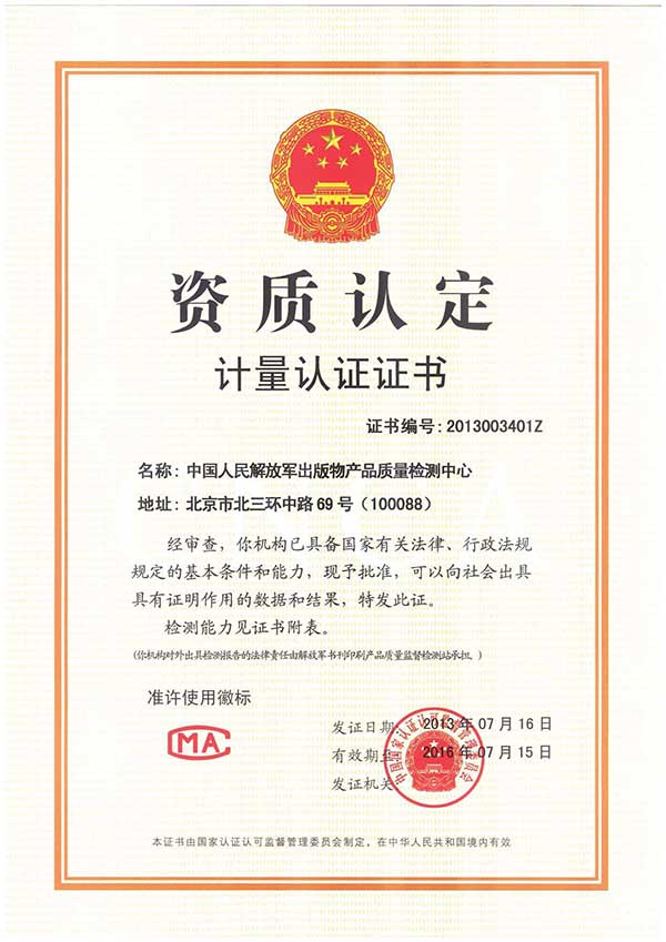 中國人民解放軍出版物產(chǎn)品質(zhì)量檢測中心(以下簡稱“檢測中心”)成立于2012年,2013年7月經(jīng)國家認(rèn)證認(rèn)可監(jiān)督委員會審核批準(zhǔn)授予中國計(jì)量認(rèn)證CMA認(rèn)可資質(zhì)。2014年9月通過國家認(rèn)證認(rèn)可監(jiān)督委員會計(jì)量認(rèn)證擴(kuò)項(xiàng)評審,批準(zhǔn)檢測能力三十余項(xiàng)。是全軍首家擁有國家級資質(zhì)的出版物產(chǎn)品質(zhì)量檢測鑒定機(jī)構(gòu),具有獨(dú)立為軍隊(duì)和社會提供公正、準(zhǔn)確的檢測數(shù)據(jù)及有法律效力的檢測報(bào)告的能力。