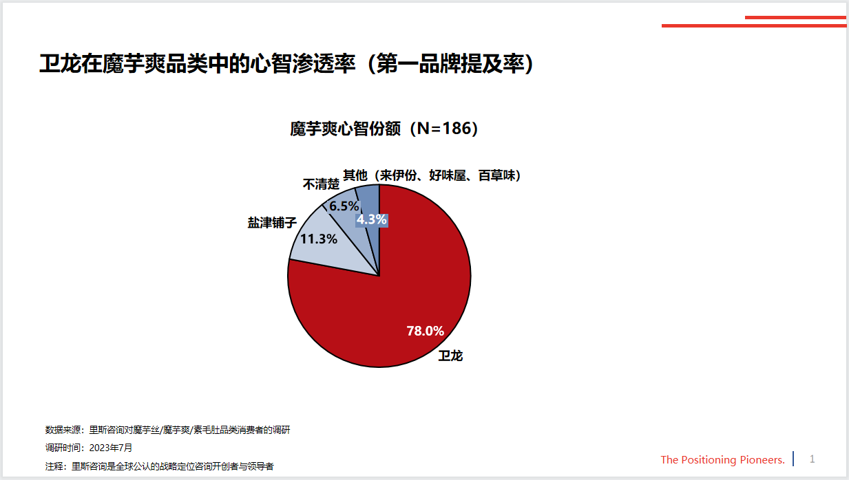 根據(jù)里斯咨詢的調(diào)研顯示,衛(wèi)龍憑借魔芋爽在同品類中的心智滲透率已達(dá)78%,遠(yuǎn)超其他品牌。就在日前,衛(wèi)龍魔芋爽在淘寶平臺(tái)上取得了“淘寶100W+”的銷售成績(jī),拿下淘寶首屆“金桃子獎(jiǎng)”,足以彰顯其在市場(chǎng)上的強(qiáng)大影響力。