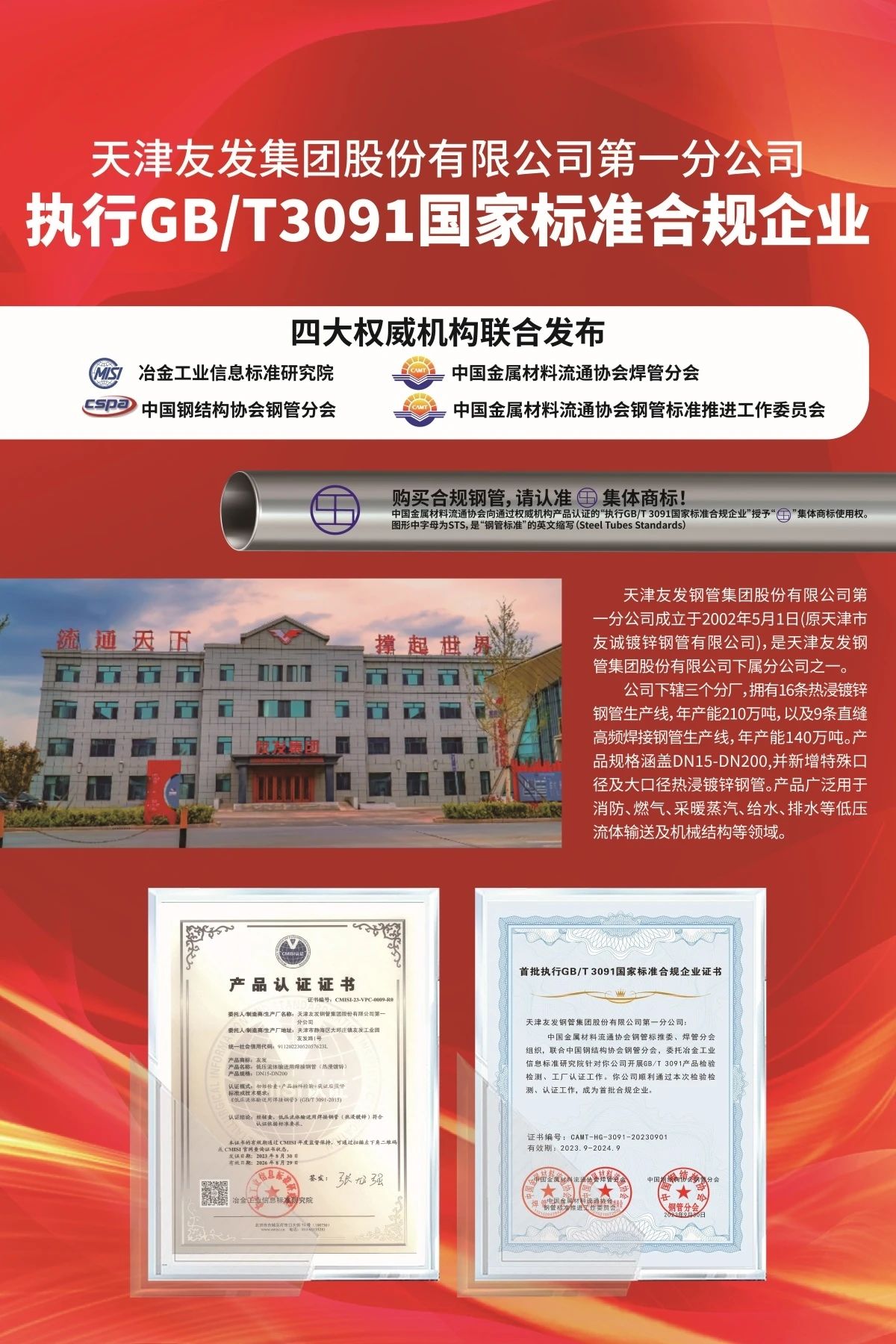 10月16日,由四大權(quán)威機(jī)構(gòu)聯(lián)合發(fā)布的首批入圍《執(zhí)行GB/T 3091國家標(biāo)準(zhǔn)合規(guī)企業(yè)名錄》的14家企業(yè)中,有5家為友發(fā)集團(tuán)旗下企業(yè)。分別為友發(fā)集團(tuán)第一分公司、唐山正元管業(yè)、邯鄲友發(fā)、陜西友發(fā)和江蘇友發(fā),涵蓋友發(fā)集團(tuán)全部鍍鋅圓管產(chǎn)品。