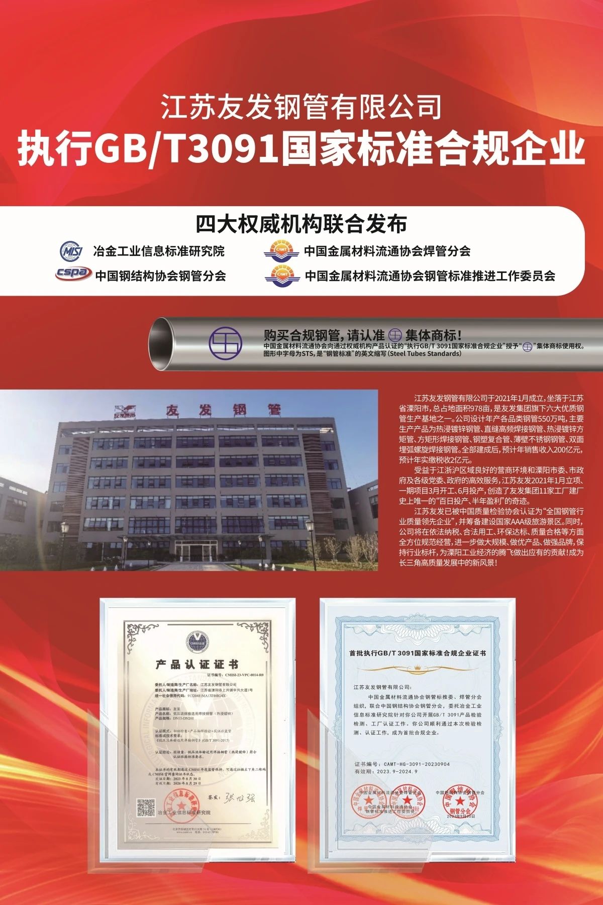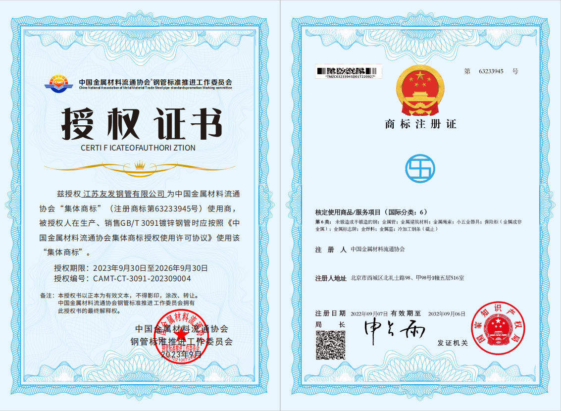 近期,中國金屬材料流通協(xié)會已經(jīng)向執(zhí)行標(biāo)準(zhǔn)合規(guī)企業(yè)授權(quán)使用 “STS(鋼管標(biāo)準(zhǔn))”集體商標(biāo)。友發(fā)集團(tuán)率先垂范,在集團(tuán)5家分子公司相關(guān)產(chǎn)品上集中加裝新的集體商標(biāo),充分發(fā)揮行業(yè)龍頭企業(yè)的“頭雁效應(yīng)”,引領(lǐng)行業(yè)規(guī)范化、健康化高質(zhì)量發(fā)展。