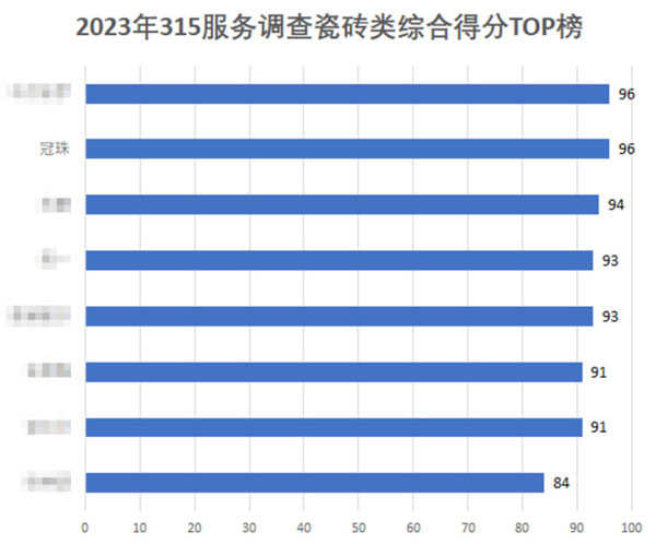 在2023年的315家居服務(wù)摸底中,共計(jì)調(diào)查了22家瓷磚品牌,綜合平均分達(dá)80.55分。其中,冠珠瓷磚以96分的成績(jī)高居第一位,再度蟬聯(lián)“年度家居行業(yè)服務(wù)榜樣”獎(jiǎng)項(xiàng)。