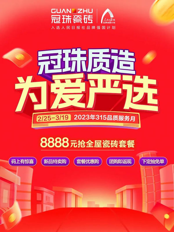 一直以來(lái),冠珠始終堅(jiān)持“嚴(yán)”字當(dāng)頭,講中國(guó)故事,打造新國(guó)貨品牌形象。被認(rèn)可的背后是優(yōu)質(zhì)的服務(wù)與口碑的沉淀。3月9-15日,冠珠瓷磚315品質(zhì)服務(wù)月再出發(fā),為愛(ài)嚴(yán)選,為品質(zhì)發(fā)聲。用更好的產(chǎn)品、更好的服務(wù)、更好的體驗(yàn),筑就國(guó)人更美好的家。