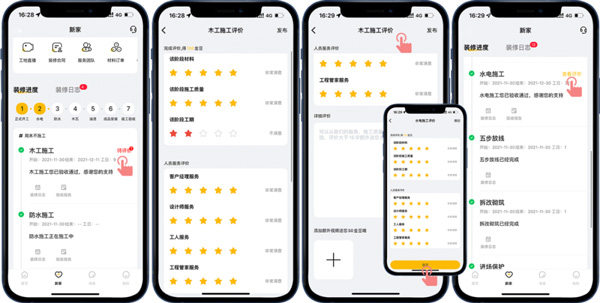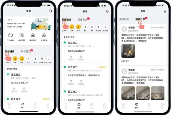通過“新家-裝修進度”和“新家-裝修日志”模式,直觀地了解到目前的裝修階段,工程隊每日的工作內(nèi)容,讓客戶在家就能了解施工進度、感受工程品質(zhì)!