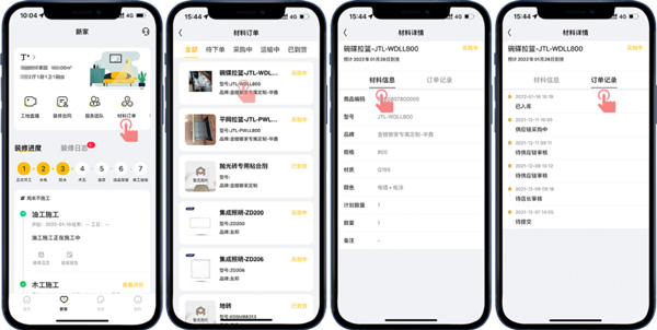 此外,也能在“新家-材料訂單”查看裝修涉及到的材料采購和到貨情況,省去客戶去現(xiàn)場查看的麻煩,如果材料未按約定時間到貨,客戶也能及時跟催門店處理,以免耽誤裝修進度。