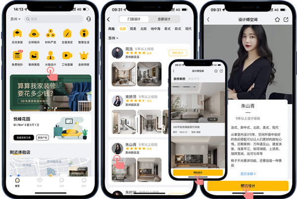 打開金螳螂家APP,進入首頁“大咖設計”,可了解設計師的個人簡介,以及他的優(yōu)秀裝修作品和客戶的真實評價,通過以上了解,客戶挑選中意的設計師,馬上預約,就可與他線上直接暢聊溝通設計方案、設計細節(jié),為客戶量身定制專屬方案。