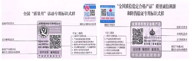 【全國“質(zhì)量月”活動專用標識】具有專屬的知識產(chǎn)權(quán)(經(jīng)中國版權(quán)保護中心審核,國家版權(quán)局于2015年7月16日對全國“質(zhì)量月”活動專用標識頒發(fā)了《作品登記證書》,登記號:國作登字-2015-L-00188457),基本規(guī)格為5cm2,集電話電碼防偽查詢、二維碼在線掃描、微信驗證、網(wǎng)站查詢等多種功能于一體,綜合運用了紐索幣紋、微縮文字、熒光激發(fā)油墨等多種防偽技術(shù);專用標識加貼在企業(yè)產(chǎn)品或包裝上,消費者(用戶)只需要用座機或手機電話撥打全國范圍內(nèi)均不需要加區(qū)號的特服號碼95105365或使用手機掃描二維碼或登陸網(wǎng)站(http://www.12365114.cn)就可直接查詢驗證加貼專用標識的產(chǎn)品為第三方質(zhì)量專業(yè)機構(gòu)權(quán)威證明的全國質(zhì)量誠信優(yōu)秀典型企業(yè)生產(chǎn)(銷售)的質(zhì)量誠信安全可靠好產(chǎn)品,形成企業(yè)自己獨有的比較優(yōu)勢。