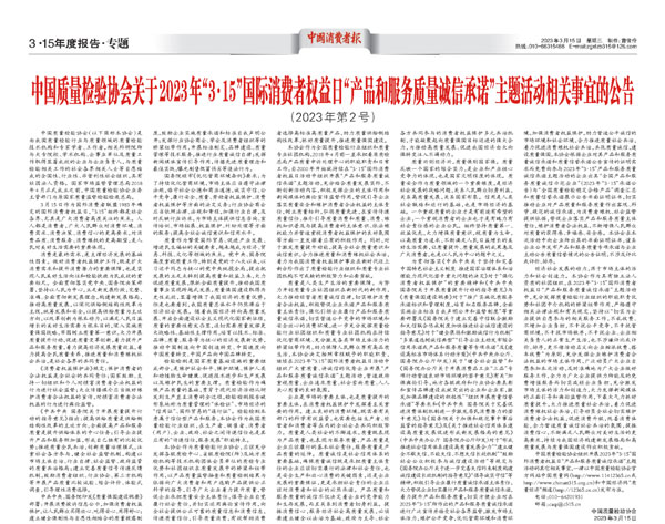 - 中國質(zhì)量報發(fā)布:共筑質(zhì)量誠信 助力放心消費——中國質(zhì)量檢驗協(xié)會組織開展2026年“…(2026-03-20)