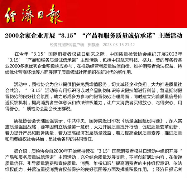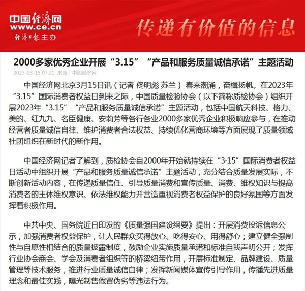 - 中國經(jīng)濟網(wǎng)發(fā)布:質(zhì)量誠信承諾 助力提振消費——中國質(zhì)量檢驗協(xié)會組織2000余家優(yōu)秀企…(2026-03-13)