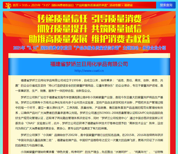 引導(dǎo)質(zhì)量消費,共筑質(zhì)量誠信,3月15日,由中國質(zhì)量檢驗協(xié)會主辦的2021年“3.15”產(chǎn)品和服務(wù)質(zhì)量誠信承諾的主題活動如期舉行,小浣熊作為“3.15”產(chǎn)品和服務(wù)質(zhì)量誠信承諾企業(yè),憑借匠心的品質(zhì)、優(yōu)質(zhì)的服務(wù)及良好的口碑,獲得協(xié)會以及權(quán)威專家的一致認(rèn)可,榮獲“全國產(chǎn)品和服務(wù)質(zhì)量誠信示范企業(yè)”,“全國質(zhì)量誠信先進(jìn)企業(yè)”、“全國質(zhì)量信譽(yù)保障產(chǎn)品”、“全國日化行業(yè)質(zhì)量領(lǐng)先品牌” 等多項榮譽(yù),《中國質(zhì)量報》、《中國消費者報》及中國質(zhì)量網(wǎng)、中國經(jīng)濟(jì)網(wǎng)、中國消費網(wǎng)等多家媒體均予以集中展示和公告。