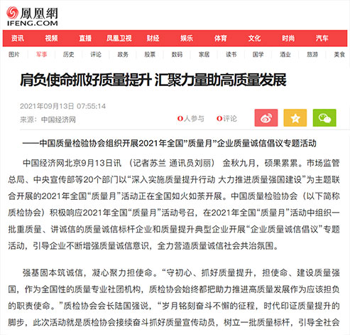搜狐網(wǎng):肩負(fù)使命抓好質(zhì)量提升 匯聚力量助高質(zhì)量發(fā)展——中國質(zhì)量檢驗(yàn)協(xié)會(huì)組織開展2021年全國“質(zhì)量月”企業(yè)質(zhì)量誠信倡議專題活動(dòng)