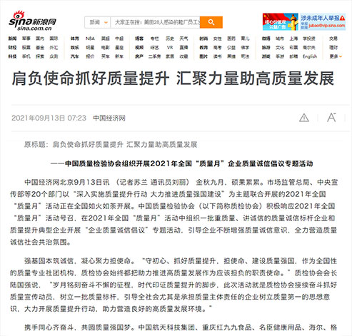 新浪網(wǎng):肩負(fù)使命抓好質(zhì)量提升 匯聚力量助高質(zhì)量發(fā)展——中國質(zhì)量檢驗(yàn)協(xié)會(huì)組織開展2021年全國“質(zhì)量月”企業(yè)質(zhì)量誠信倡議專題活動(dòng)
