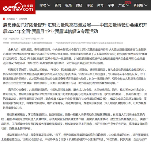 央視網(wǎng):肩負(fù)使命抓好質(zhì)量提升 匯聚力量助高質(zhì)量發(fā)展——中國質(zhì)量檢驗(yàn)協(xié)會(huì)組織開展2021年全國"質(zhì)量月"企業(yè)質(zhì)量誠信倡議專題活動(dòng)