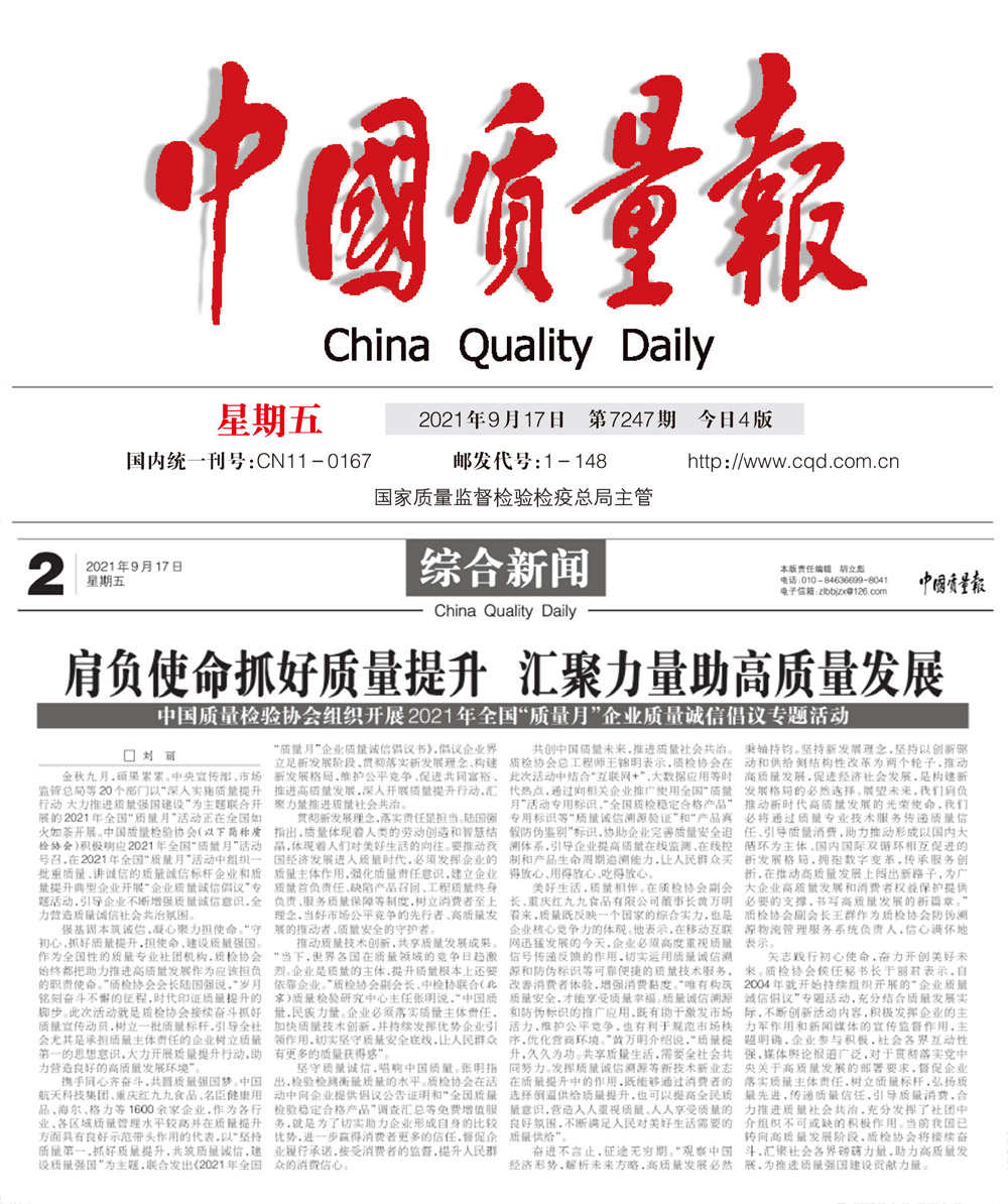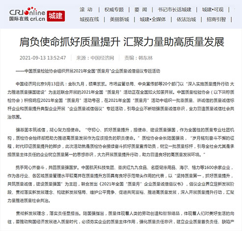中央廣播電視總臺(tái)國際在線:肩負(fù)使命抓好質(zhì)量提升 匯聚力量助高質(zhì)量發(fā)展——中國質(zhì)量檢驗(yàn)協(xié)會(huì)組織開展2021年全國"質(zhì)量月"企業(yè)質(zhì)量誠信倡議專題活動(dòng)