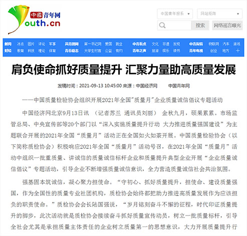 中國青年網(wǎng):肩負(fù)使命抓好質(zhì)量提升 匯聚力量助高質(zhì)量發(fā)展——中國質(zhì)量檢驗(yàn)協(xié)會(huì)組織開展2021年全國"質(zhì)量月"企業(yè)質(zhì)量誠信倡議專題活動(dòng)